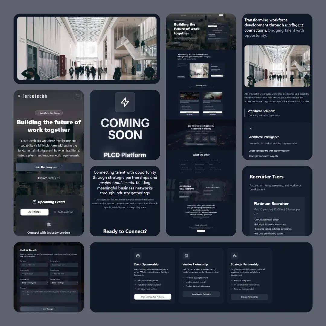 ForceTechh is a pre-launch foundation website designed to establish the brand’s digital presence ahead of its core PLCD platform. The platform introduces ForceTechh’s vision in workforce intelligence, promotes upcoming events, and captures high-intent leads to drive early traction and market visibility.